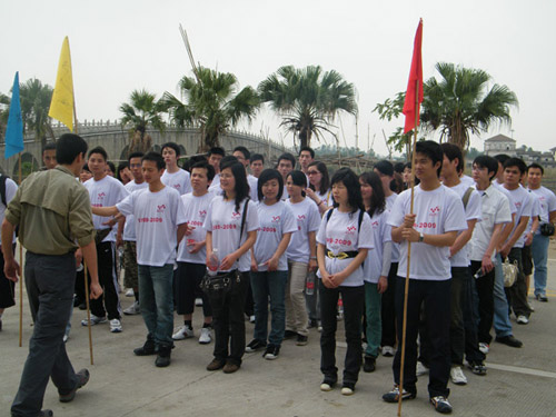 上午9:00,着上统一的服装,队伍向鹤山开进。在途中各大歌神献才显艺,在欢笑中抵达了拓展中心。